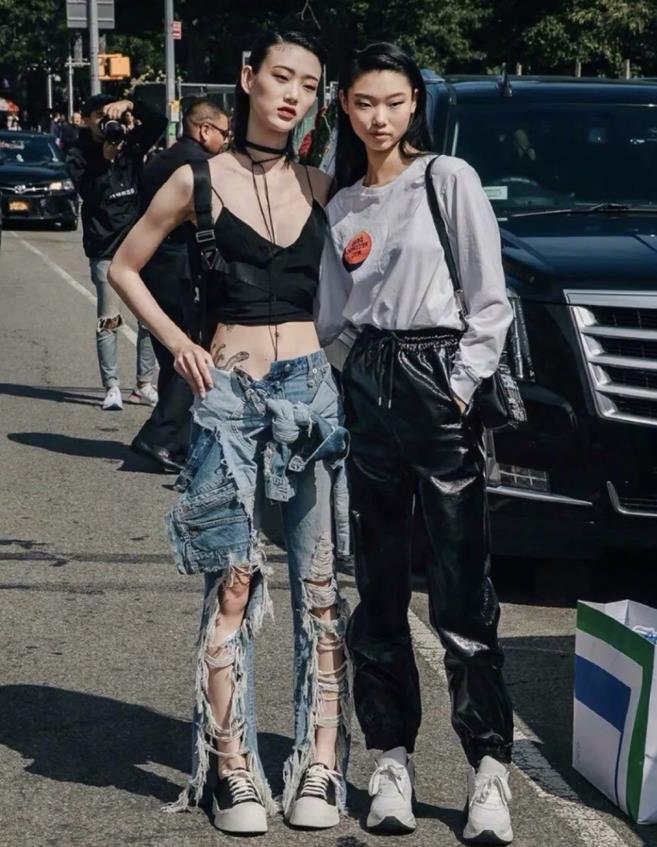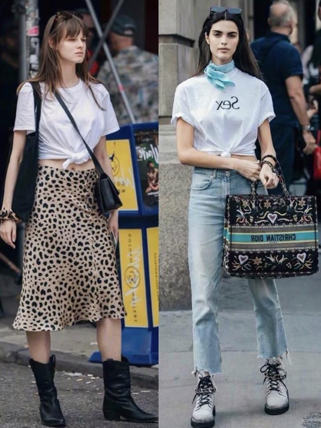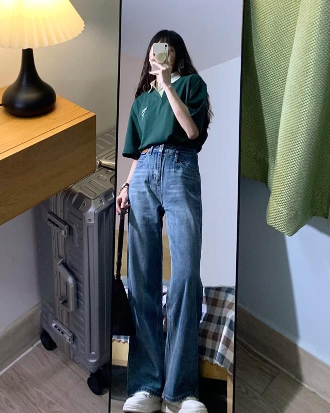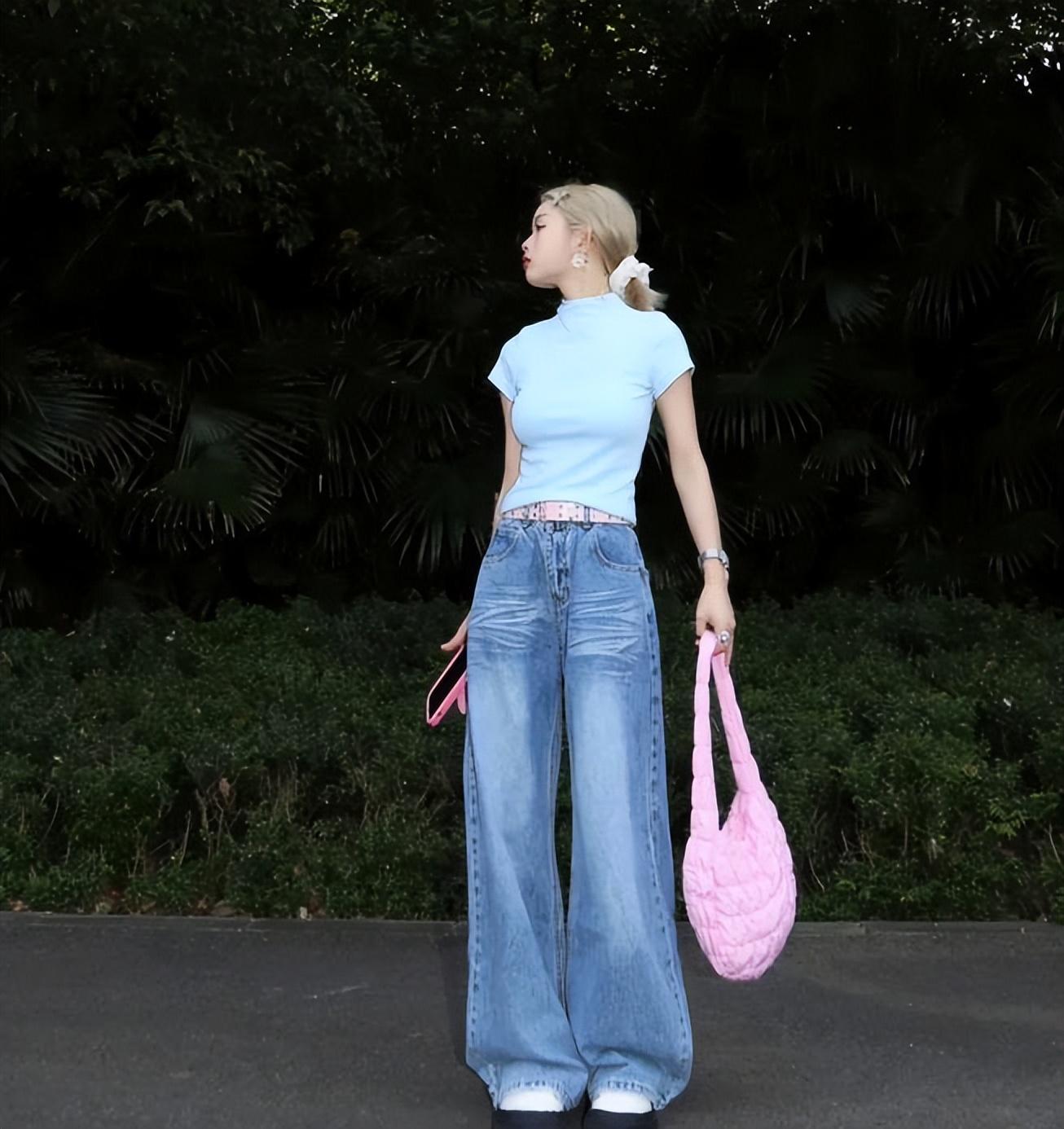 上短下長的搭配,這麼穿視覺上看起來都很顯高,上身比例好的姐妹,一定要試試這種緊身的正肩t恤,能很好修飾你的上身比例。選擇牛仔闊腿拖地褲相配,也不會給人拖沓感,反而是能很好拉長腿部線條。