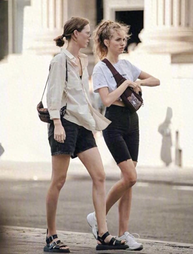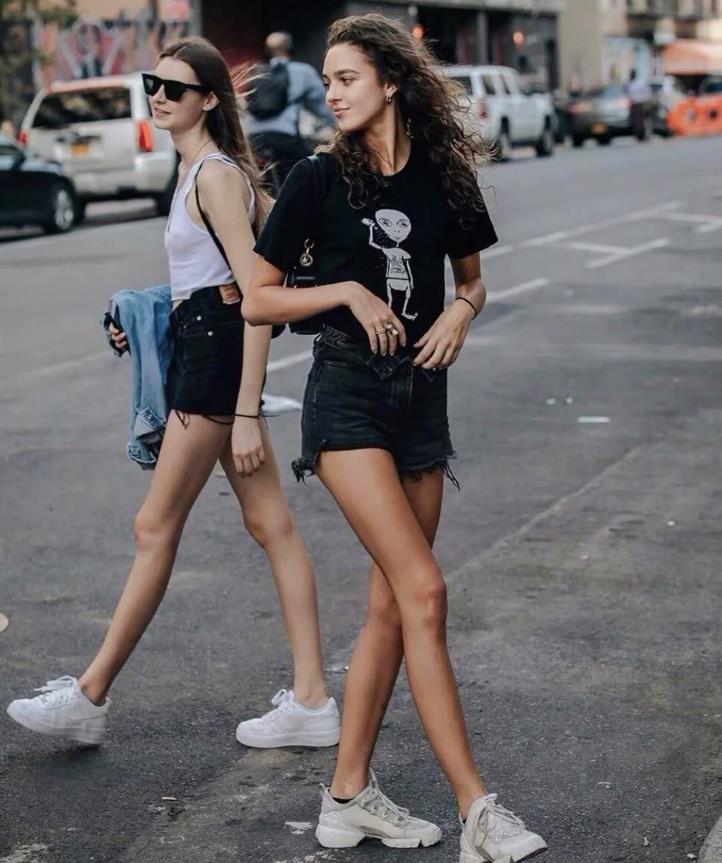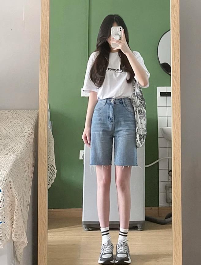在夏天裏,又怎能沒有一條短褲呢?經典牛仔款式,很時尚和百搭,褲筒是挺括的版型,可以修飾和遮掩腿粗的缺點。上衣簡單配件短袖t恤就很舒適好看了。記得要把t恤塞進褲子裏面,提高腰線比例的同時,又能拉長腿部線條。