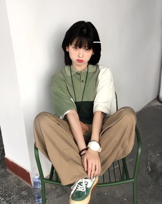 充滿日系的夏季穿搭,撞色設計的polo領短袖衫,搭配卡其色工裝褲來穿,一整個帥氣極了,上下的版型都是寬鬆的,有種很鬆弛的時髦感。