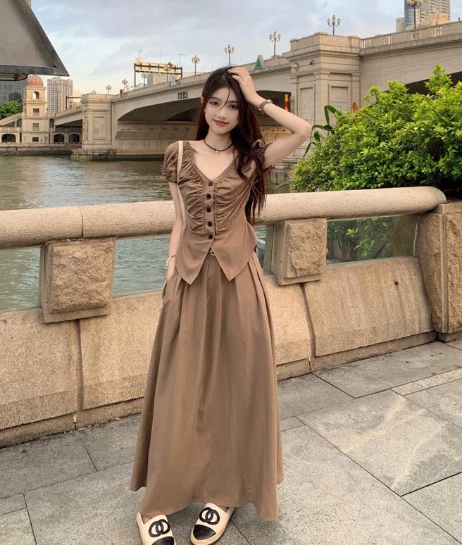 夏季最不可缺的就是套裝了,這一套很顯白又耐看的套裝,能輕鬆打造出溫柔與知性感,上衣是一件短袖t恤,下襬開叉的設計,頗有小心機的,搭配高腰半身長裙,巧妙遮掩住肉肉又能拉長腿部線條。