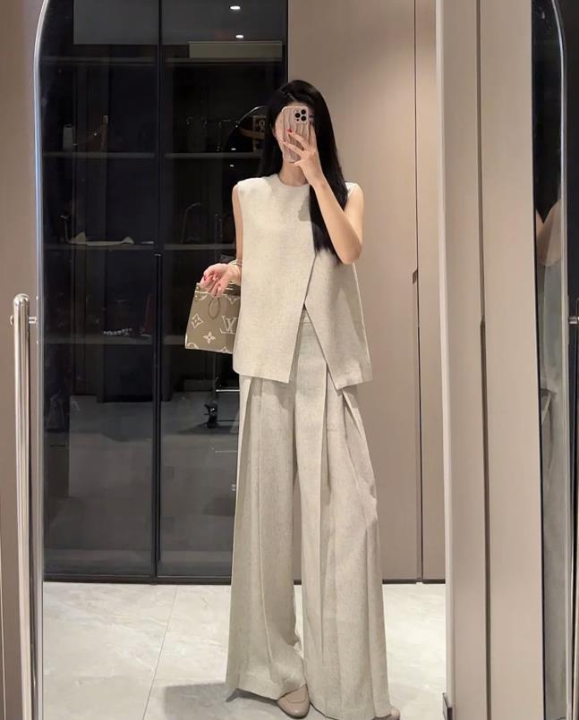 喜歡簡約風的姐妹們,這一款套裝真的不妨試試看,上衣是一件無袖衫,下襬的設計細節感滿滿,也很不失個性。搭配同色的闊腿長褲,褲子的面料質感也是非常棒的,很藏肉顯瘦。