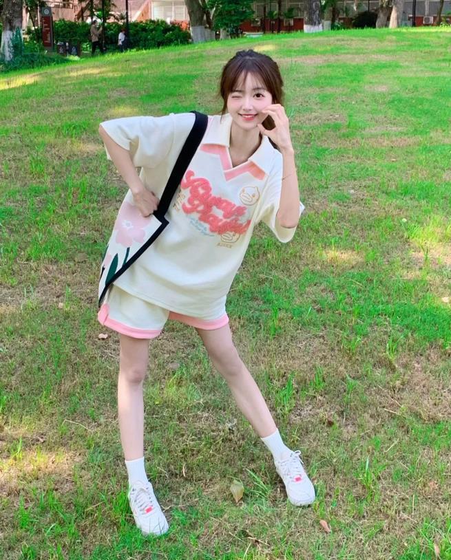 夏天穿這套粉白套裝真的太好看了,高馬尾+粉粉嫩嫩顏色的套裝,一整個人都變得很甜很嫩,也超級減齡。粉色系的配色,學院風滿滿,上下裝的版型都是寬鬆的,可藏肉顯瘦了。小個子女生很適合這麼一套,出門簡單配一雙運動鞋就可以了。
