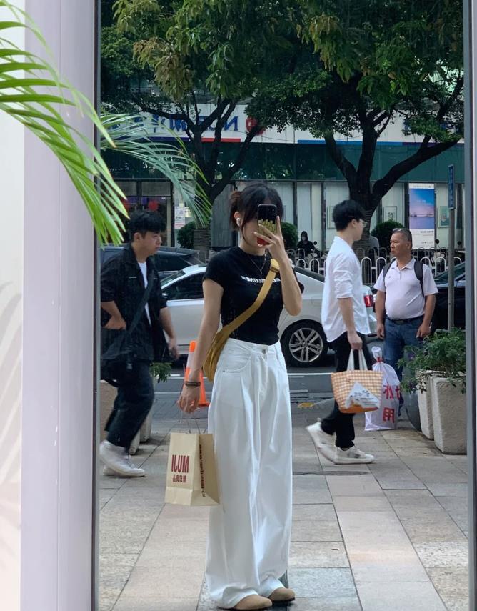 今年上短下長的搭配是真的很火啊,小個子女生很適合這種穿搭方式,黑色短款T恤,搭配白色拖地褲,喜歡這種鬆弛感滿滿的感覺,再加上褲子的垂墜感也是極佳的,能巧妙拉長腿部線條。