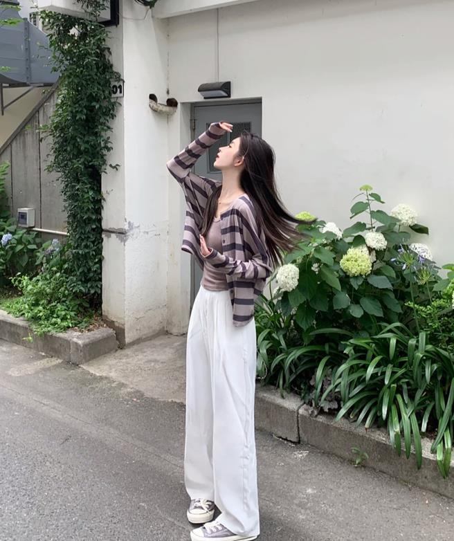 韓裏韓氣的一天,灰咖色條紋衫,穿起來真的很好看啊,與白色拖地褲相配,一簡一繁的組合,很好爲整個造型增加了層次感。白色的褲子很適合夏天呢,在這個季節穿起來清爽感十足。鞋子配一雙帆布鞋就很好看了。
