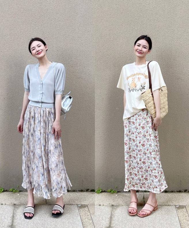 夏日裏又怎能少了碎花半裙?在裙子的長度上,記得要入手到腳踝位置,因爲這個長度穿起來更顯優雅和氣質,也能巧妙遮掩住腿部的缺點。上衣無論是選擇t恤,還是襯衫,亦或者是針織短袖,都是非常好看的。