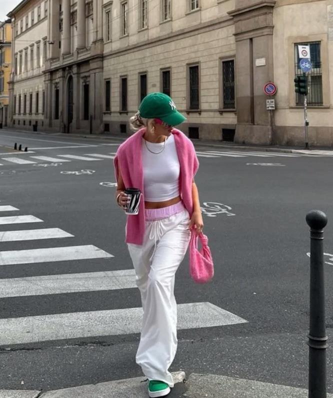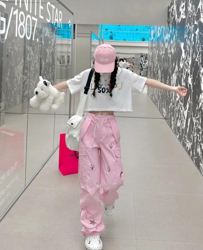 美式甜酷風穿搭,這一套看起來也太不錯了,粉色工裝褲,任誰看到都無法拒絕吧它的顏色不是深粉,而是淺淺的粉色,讓人看起來很嫩也顯白,選擇一件刺繡短袖T恤相配,上短下長的搭配方式,顯腿長效果絕了!