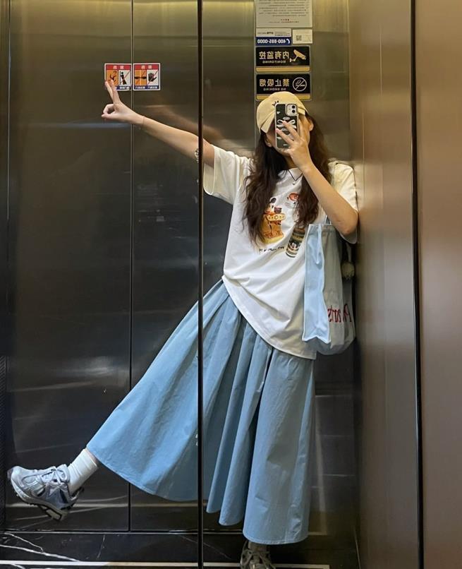 很適合小個子女生的一套穿搭,整個風格很韓呢,喜歡裙子的顏色,是那種低飽和度的藍色,傘字形狀的裙子,特別適合梨形身材,胯寬大腿粗都可以輕鬆駕馭。選擇一件白色t恤相配,藍色+白色,清爽又吸睛。