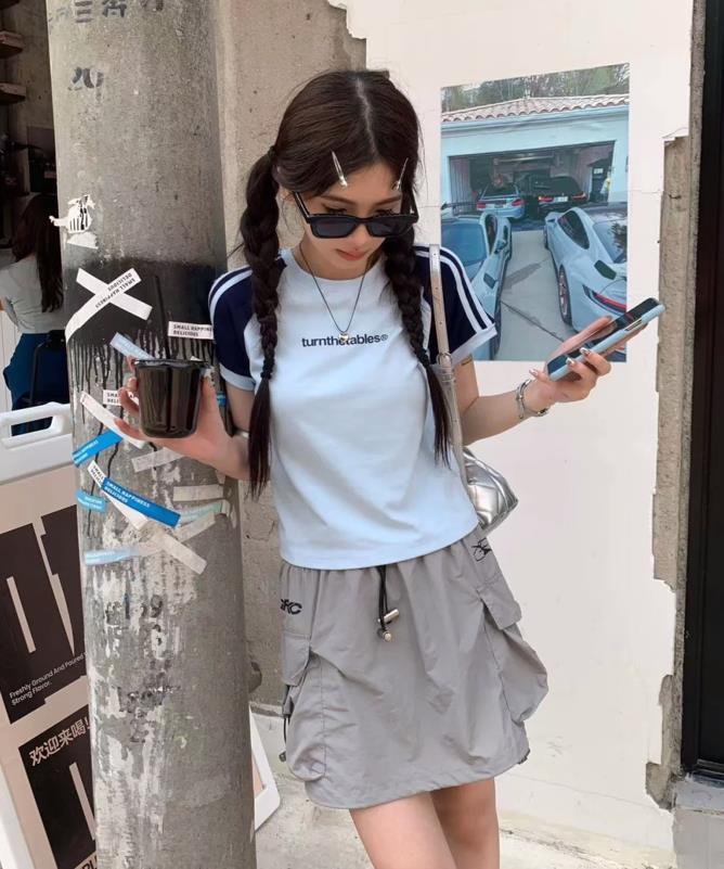 今年夏天,短款t恤可真的太流行了,baby藍色短袖t恤,這個色調可以把膚色襯托得很白皙,利落的短款,穿起來不僅提高腰線比例,還能將下身的線條給拉長,在視覺上也非常顯高挑。