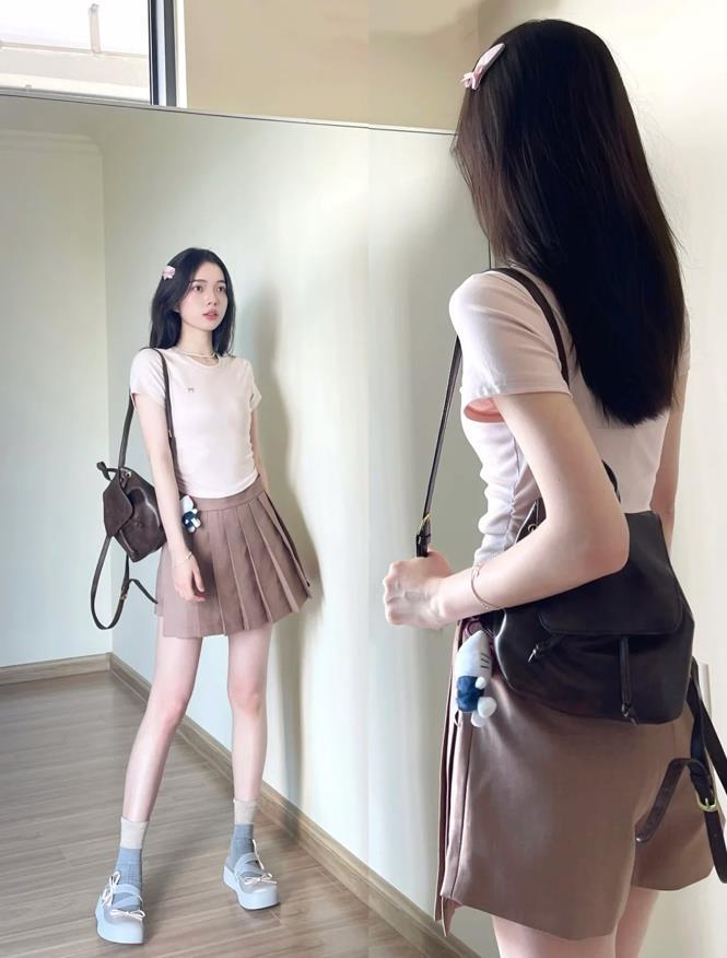 青春美少女的一套穿搭,整體看起來很簡單也舒適,短款t恤+百褶短裙,很好打造出青春與活力。小個子女生夏天就可以這麼穿,當然了,腿部線條比例好的姐妹,就可以大方穿起這種短裙。