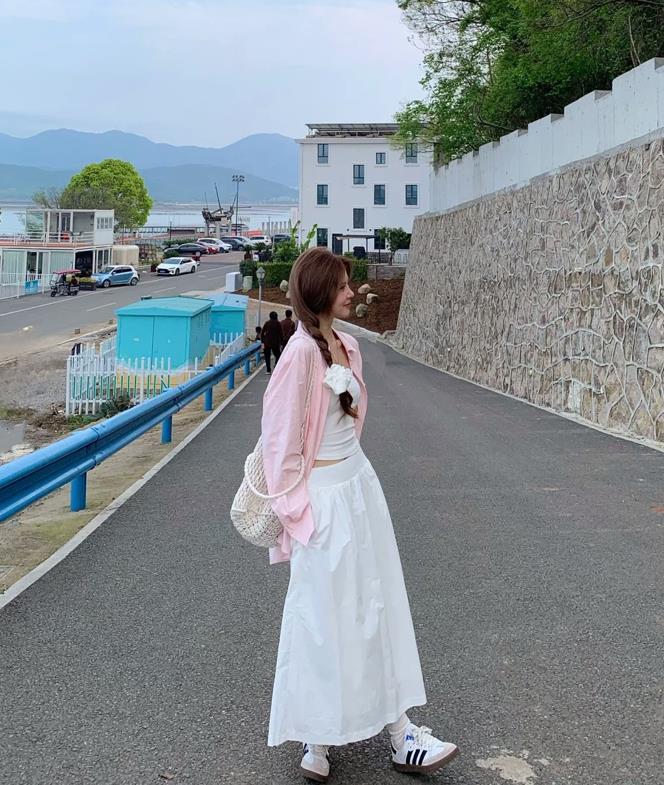 粉色襯衫和白色半身長裙,這樣一套穿搭真的太適合夏天了,粉配白的顏色組合,實在是太好看了,整個人都很減齡,少女範十足。白色半身長裙,版型是偏a字形狀的,遮肉且顯瘦,很清新好看。