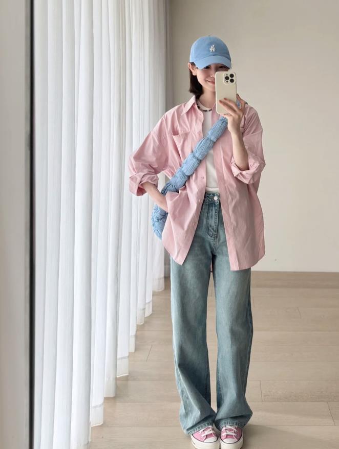 輕薄款的粉色襯衫,疊穿白色t恤,再搭配一條牛仔闊腿褲,腳下配的粉色帆布鞋,很好與襯衫進行了呼應,讓整個穿搭的協調性變得更好。