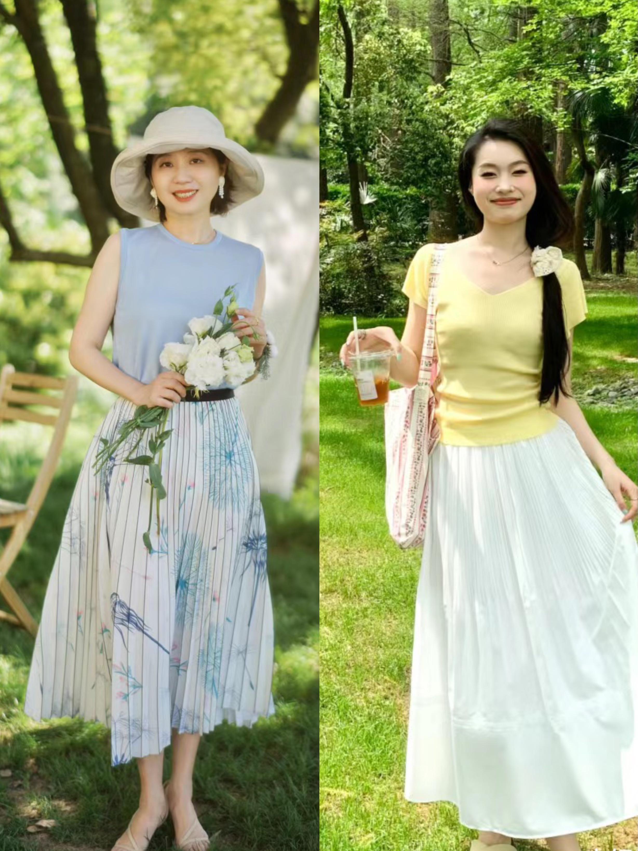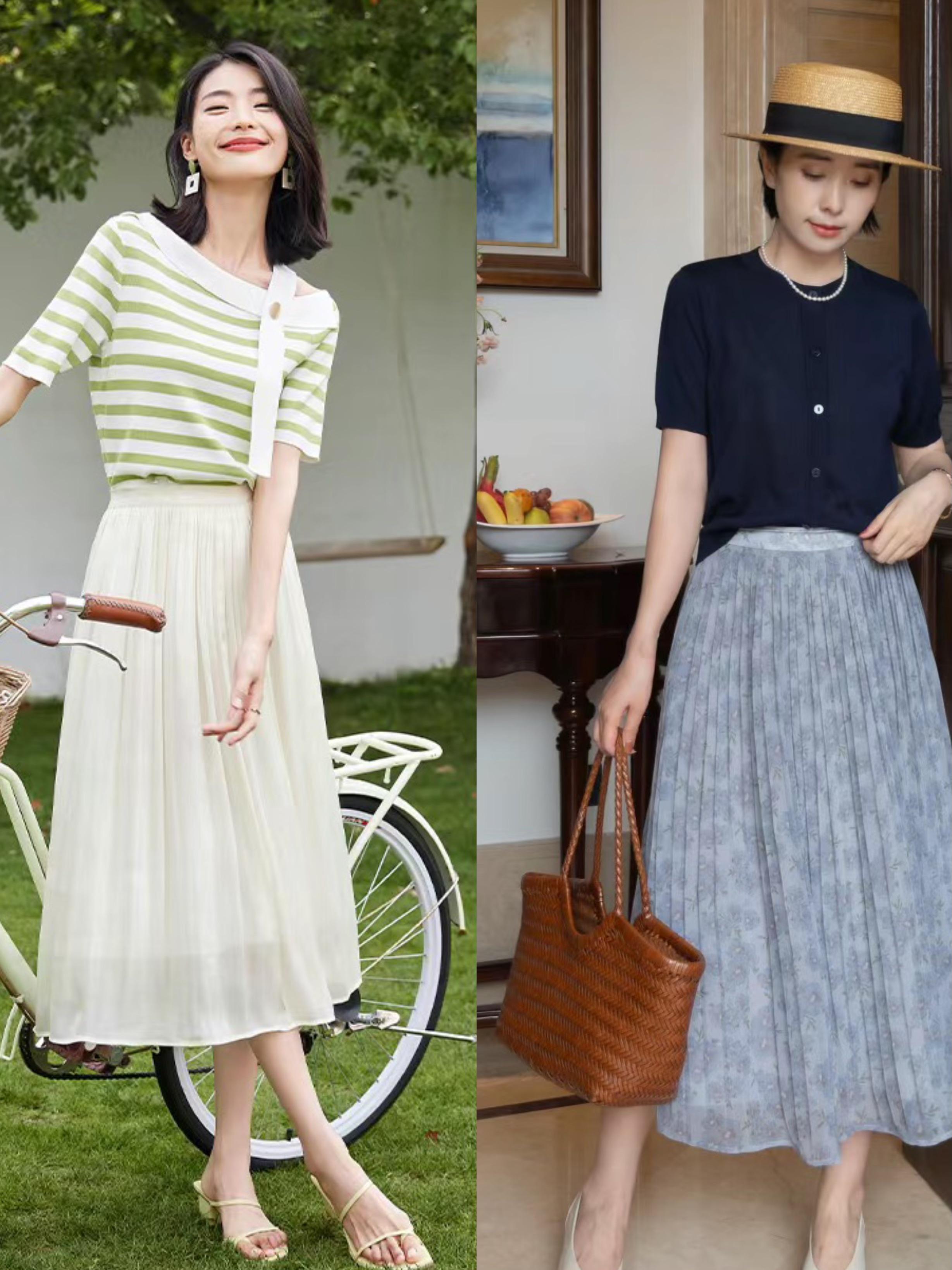 選擇半身裙的時候,我們可以搭配高腰的款式,配合流暢的A字形或者傘裙剪裁。裙襬可以選擇大量感的設計,能夠將針織短袖的柔美與女性的魅力完美集合。