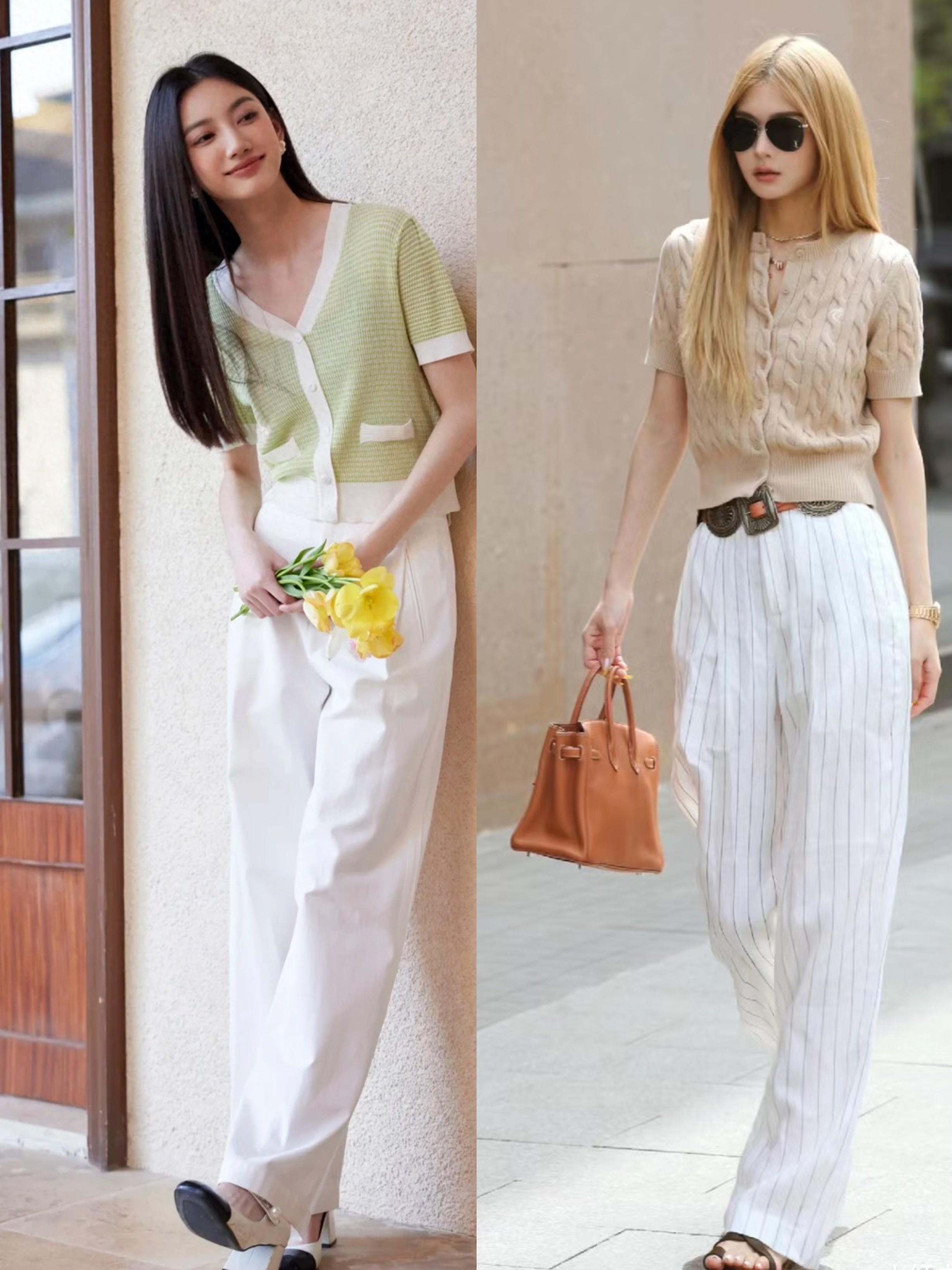 如果是稍微修身一點的針織短袖,就更適合搭配闊腿褲來穿着了。將上短下長、上緊下松的穿搭公式完美融合,會擁有更卓越的身材修飾性。
