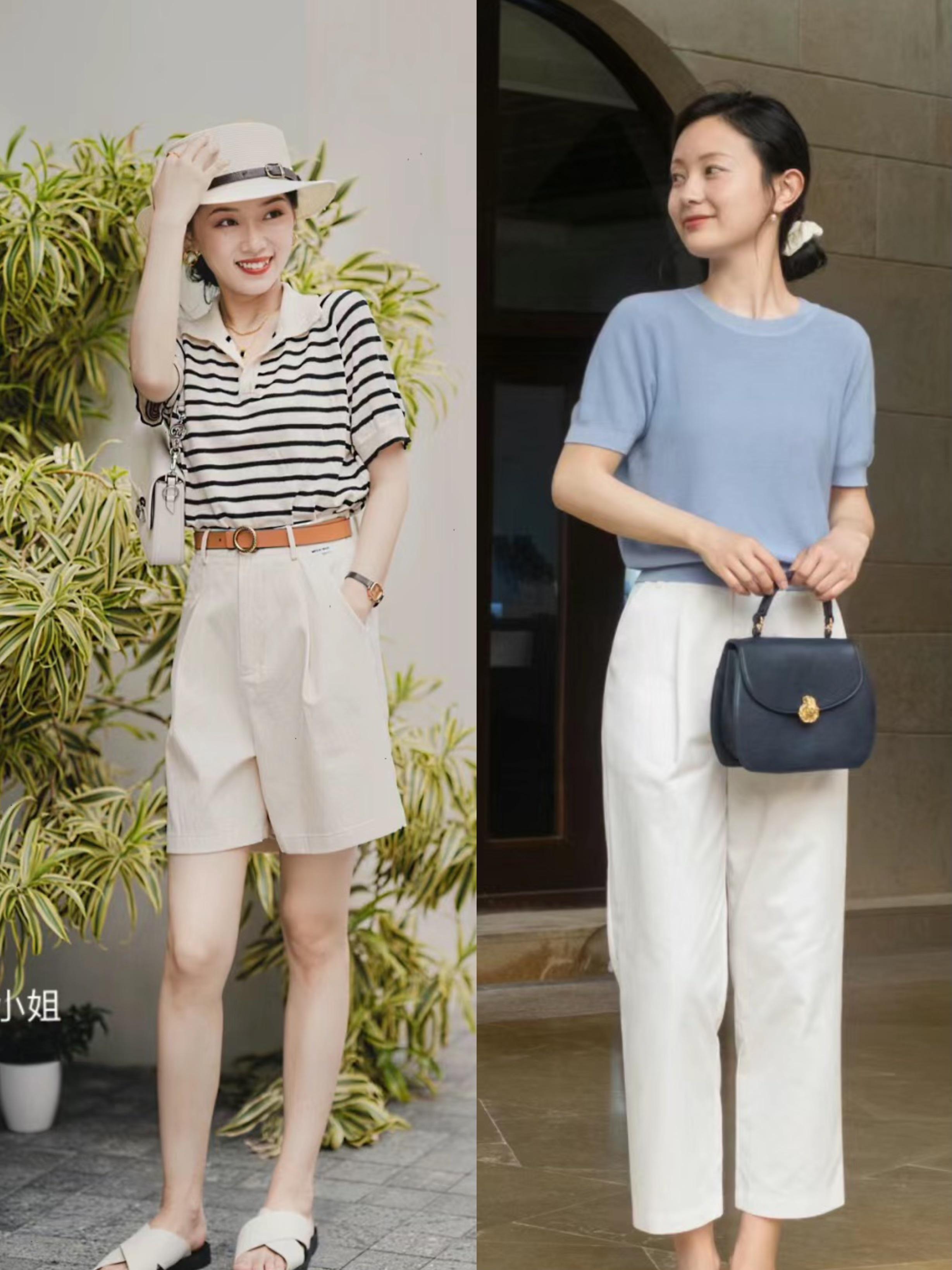 首先就是顏色的選擇,在夏天裏穿着針織短袖,儘量搭配比較柔和的淺色系。比如米白色、杏色、粉色、淺藍色的針織短袖,都自帶降溫效果。