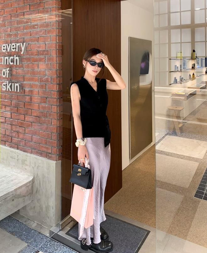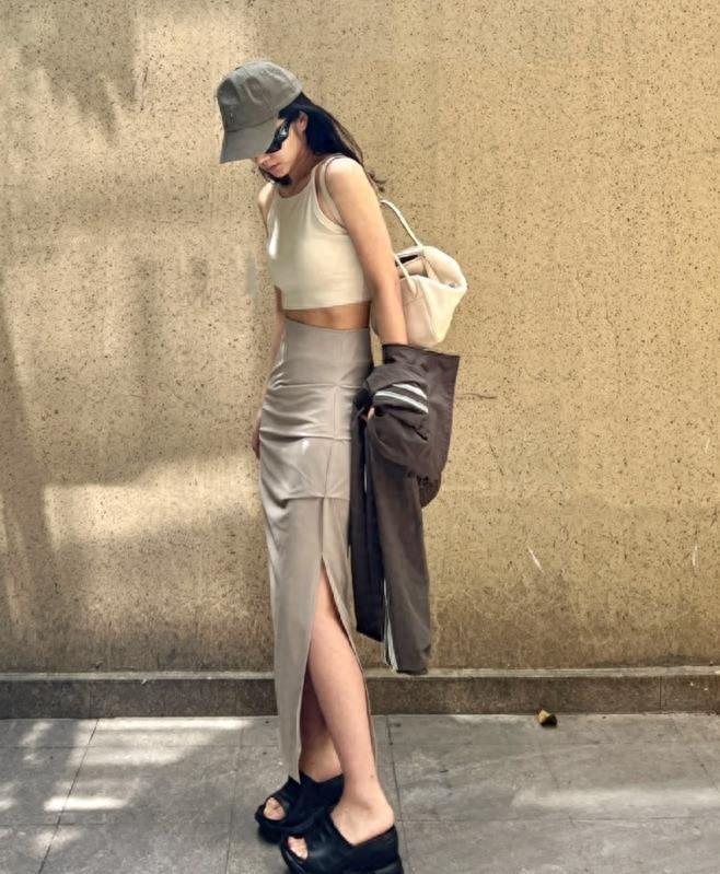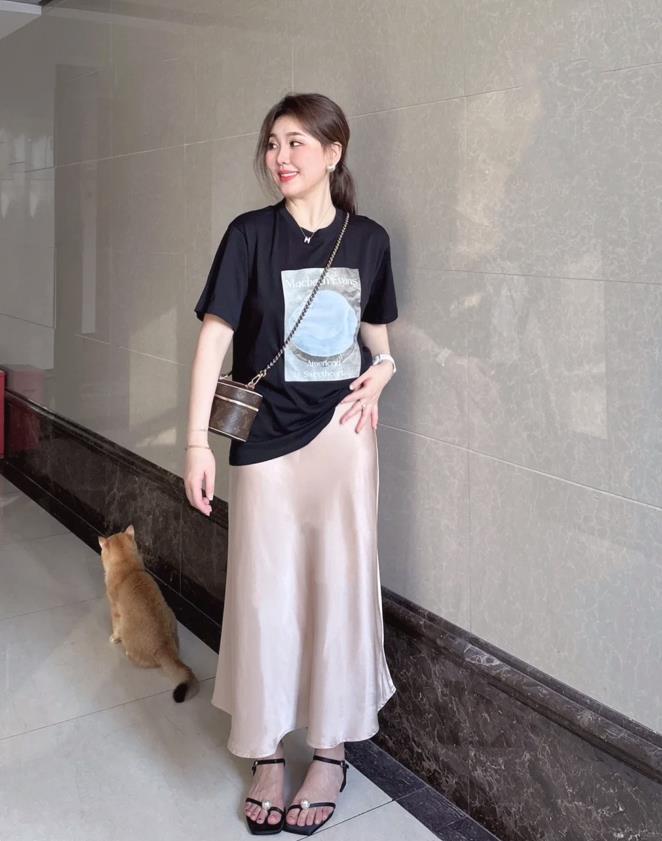 今年真的很流行穿緞面裙啊,這麼一條裙子,穿起來也太美了,超級溫柔的,灰紫色瞧着就很顯高級,這個光澤度看起來就很美。上衣可以配黑色的短袖t恤,或者是背心之類的都可以。