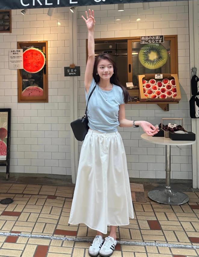 藍白配色真的太適合夏天穿了,你覺得呢?淺藍色的短袖t恤,可以把膚色襯托得很白皙,選擇一條白色a字半身裙,很藏肉顯瘦,也讓你穿得得體大方。再搭配一雙運動鞋就更好看了。