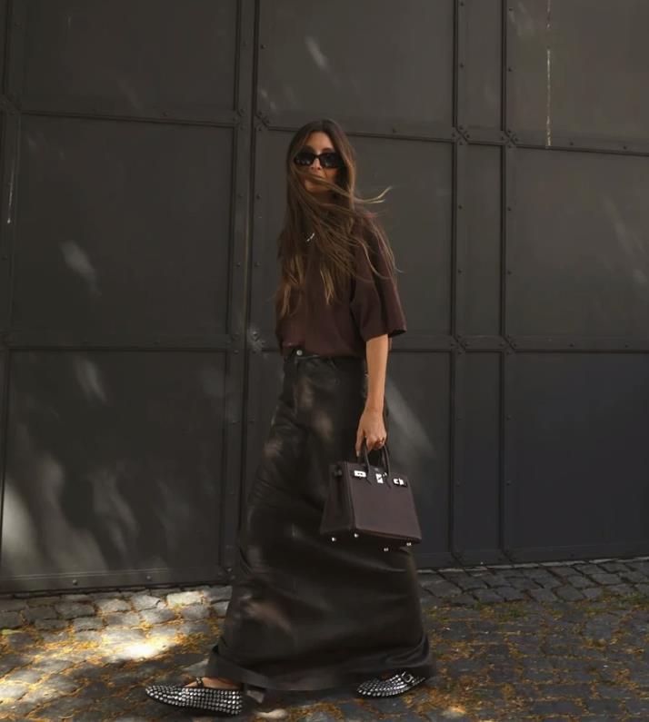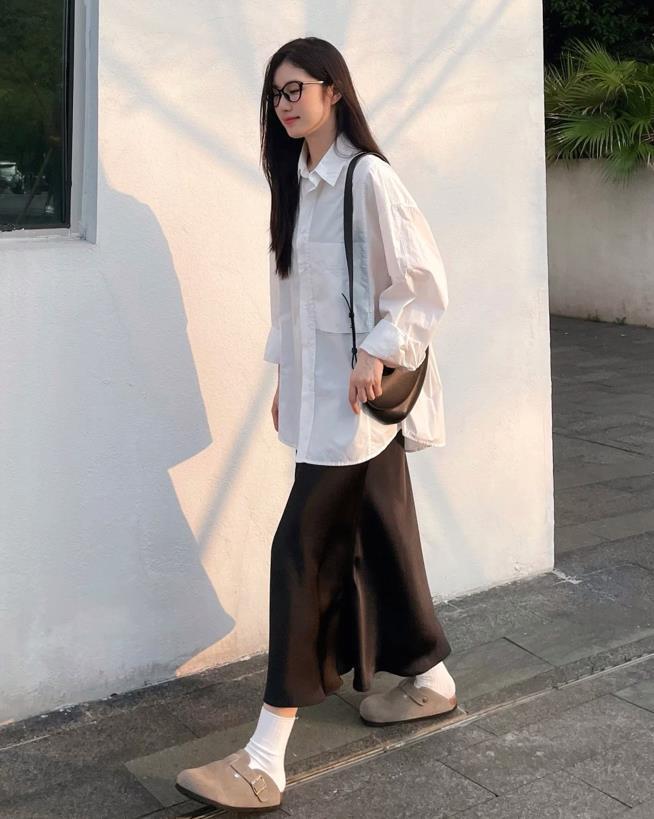 除了牛仔半裙之外,緞面材質的裙子,也是今年最流行的款式,黑色緞面半身裙,質感是非常不錯的,自帶光澤感,莫名就給人一種高級感。經典的黑色,真的是非常百搭,與白色襯衫相配,有種極簡風,好看又不過時。