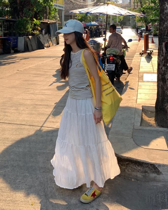 巨好搭配的一條白色半身長裙,細節感很強的款式,裙身上面帶着的皺褶感,穿起來更時髦了。版型是偏a字形狀的,十分藏肉顯瘦。搭配起一件條紋背心,一整個清爽涼快。
