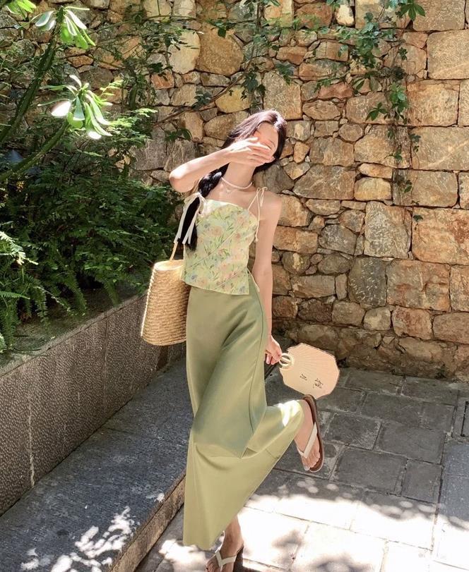 去旅行遊玩要怎麼穿呢?這一套看起來就非常不錯,薄荷綠提花小吊帶+緞面魚尾半身長裙,這麼穿看起來就非常溫柔的,也很顯氣質。炎熱的夏季,這麼穿既不失小性感,又清爽涼快。
