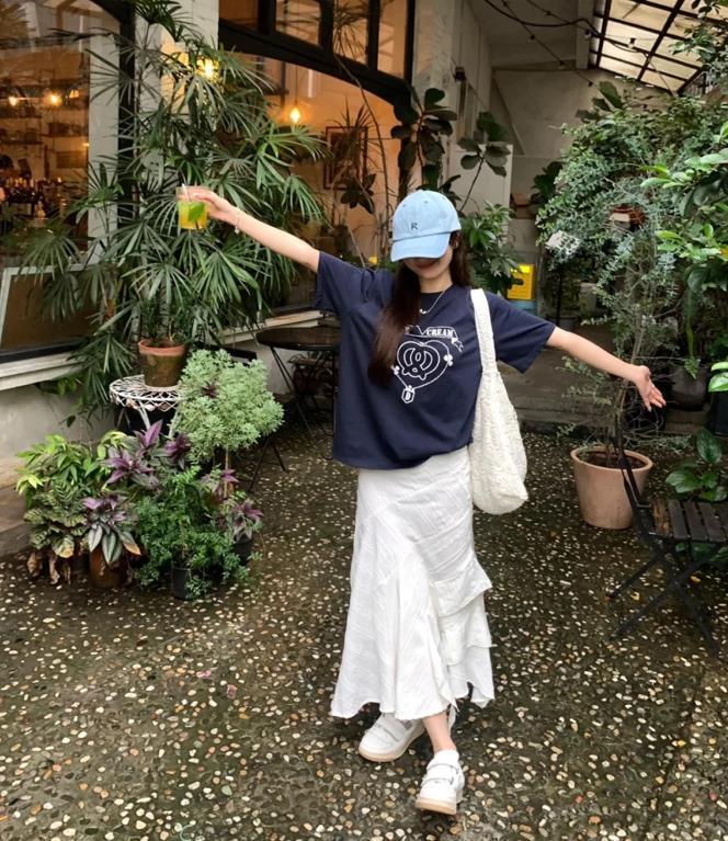 寬鬆的t恤+白色半身裙,這一身鬆弛感的搭配今年可是很流行呢,簡單舒適,超級適合日常逛街和度假的。藏藍色的t恤很顯白又襯膚色,搭配不規則白色半裙,高腰+魚尾的設計,讓你穿起來可美啦,一整套又韓又顯瘦。