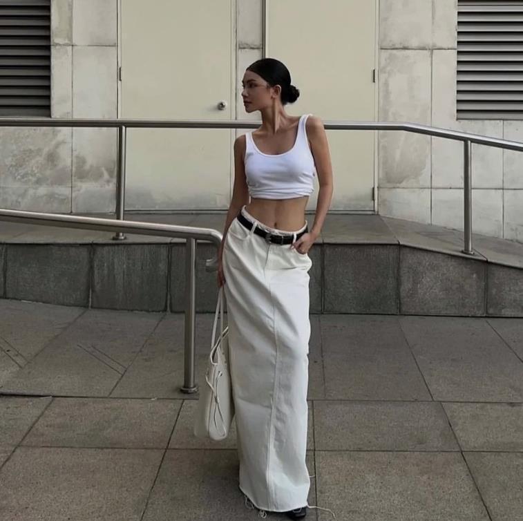 在明媚的夏日,穿上一件白色t恤+牛仔半裙,簡單又不失清新感,在選擇版型的時候,根據自己的身材進行挑選。像直筒裙身的版型,對身材具有極佳的包容性,藏肉且顯瘦。