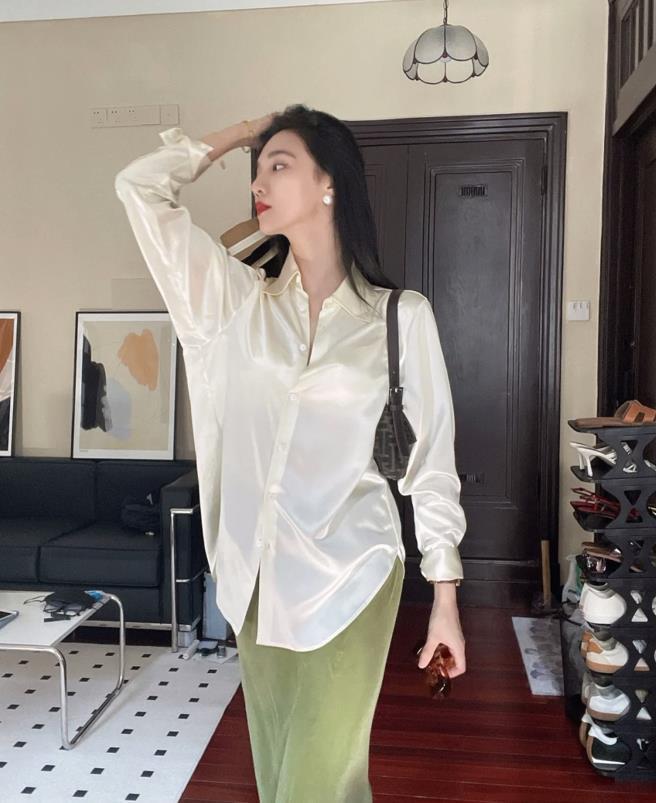 真絲襯衫的色彩很溫潤,在光線的襯托下,會散發出淺淺淡淡的光澤,溫婉又不失高雅。剪裁得體,版型寬度適中的設計,讓穿着者既感受到舒適感,又能打造出幹練利落的造型。