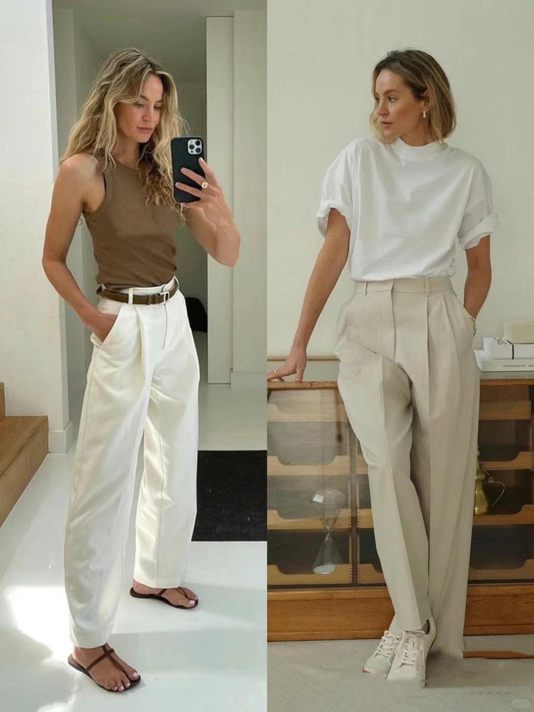 40+女人的沉穩與內斂,更需要憑藉低調的配色來表達。比如白色T恤+同色系的西裝褲,或者棕色背心+白色直筒褲,配色上乾淨清爽、視覺上也有一定的降溫效果。