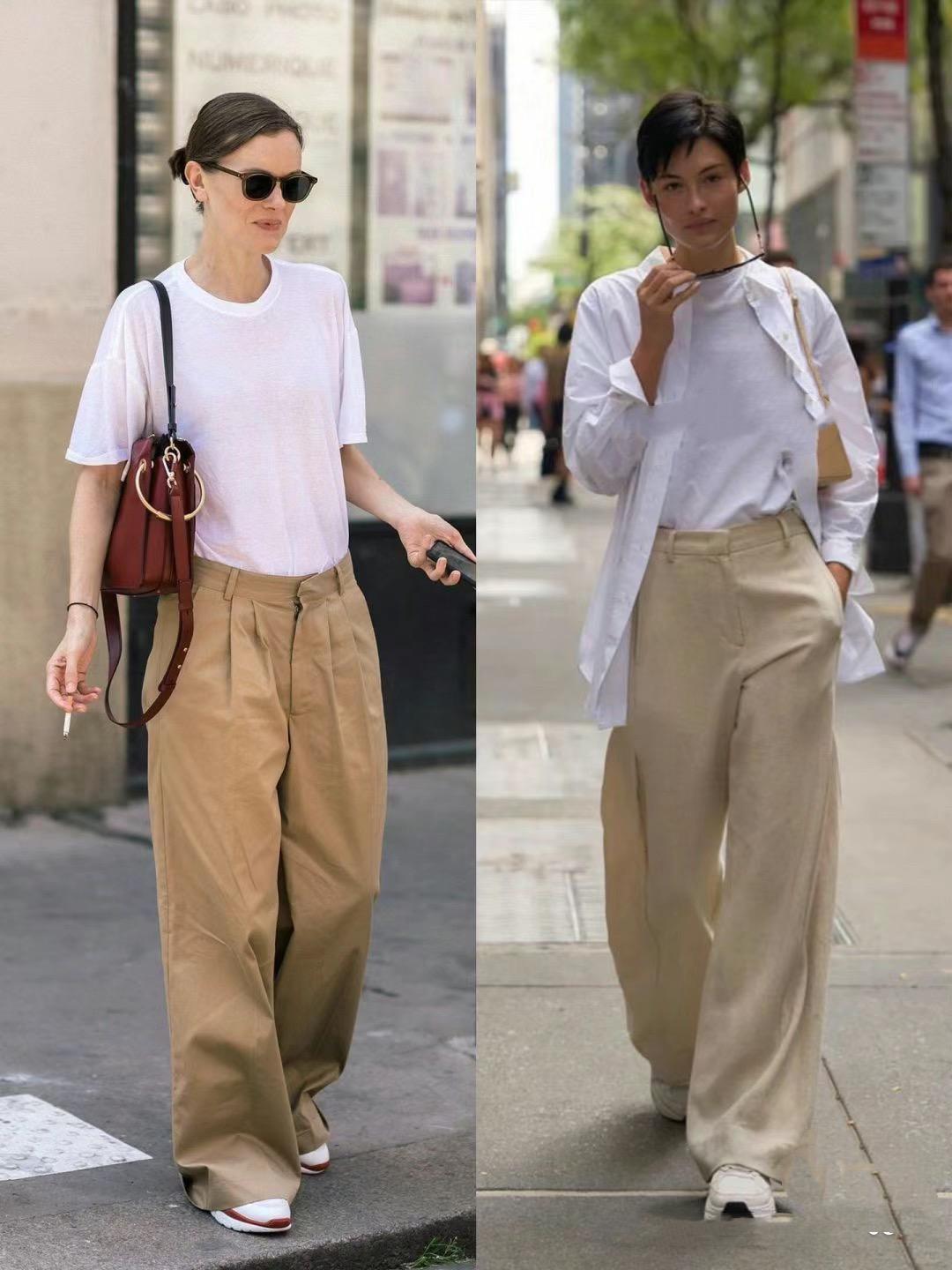 比如寬鬆的白色襯衫,一定是要搭配純色淨版的設計。不知道選擇哪一種領口,就選擇不會出錯的圓領。看似基礎低調的寬鬆白襯衫,搭配卡其色的高腰褲、清爽又提氣質。