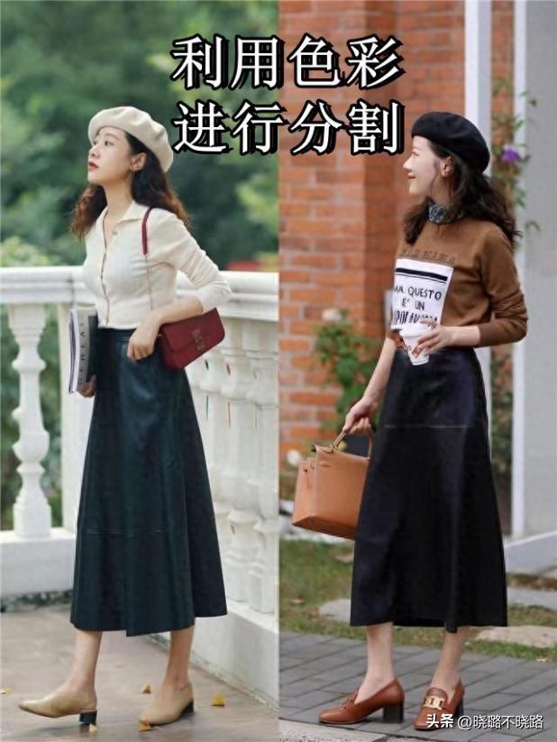 在我們的上裝和齊踝裙的挑選過程中,可以多多運用不同顏色來進行搭配。這樣在色系對比的效果下,可以讓我們的比例得到更好的修飾。最經典的就是深色和淺色的對比,淺色用於上身提亮,而深色用於下身顯瘦。或者選擇冷暖色系進行對比,去加強造型的時髦感,也能讓身材比例形成分割。