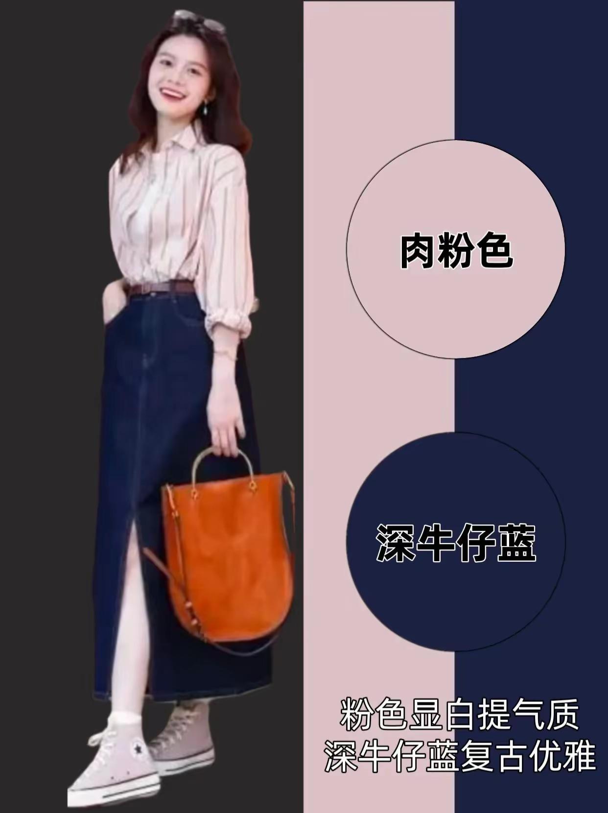 用肉粉色的襯衫來搭配高腰的牛仔藍半身裙,反差對比的配色層次感更強。這種深藍色的牛仔半身裙,開叉的裙襬顯腿長還顯膚白,復古優雅。