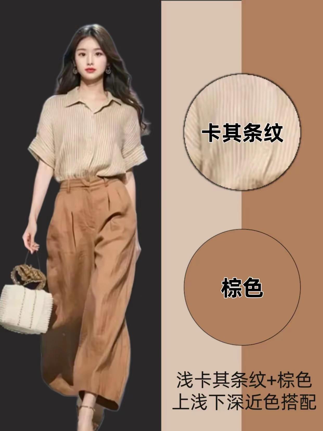 這種配色、可以優雅文藝、也可以利落幹練。復古風、或者職場穿搭,都比較常見。淺卡其色的條紋襯衫,配棕色西裝闊腿褲,隨性大方。