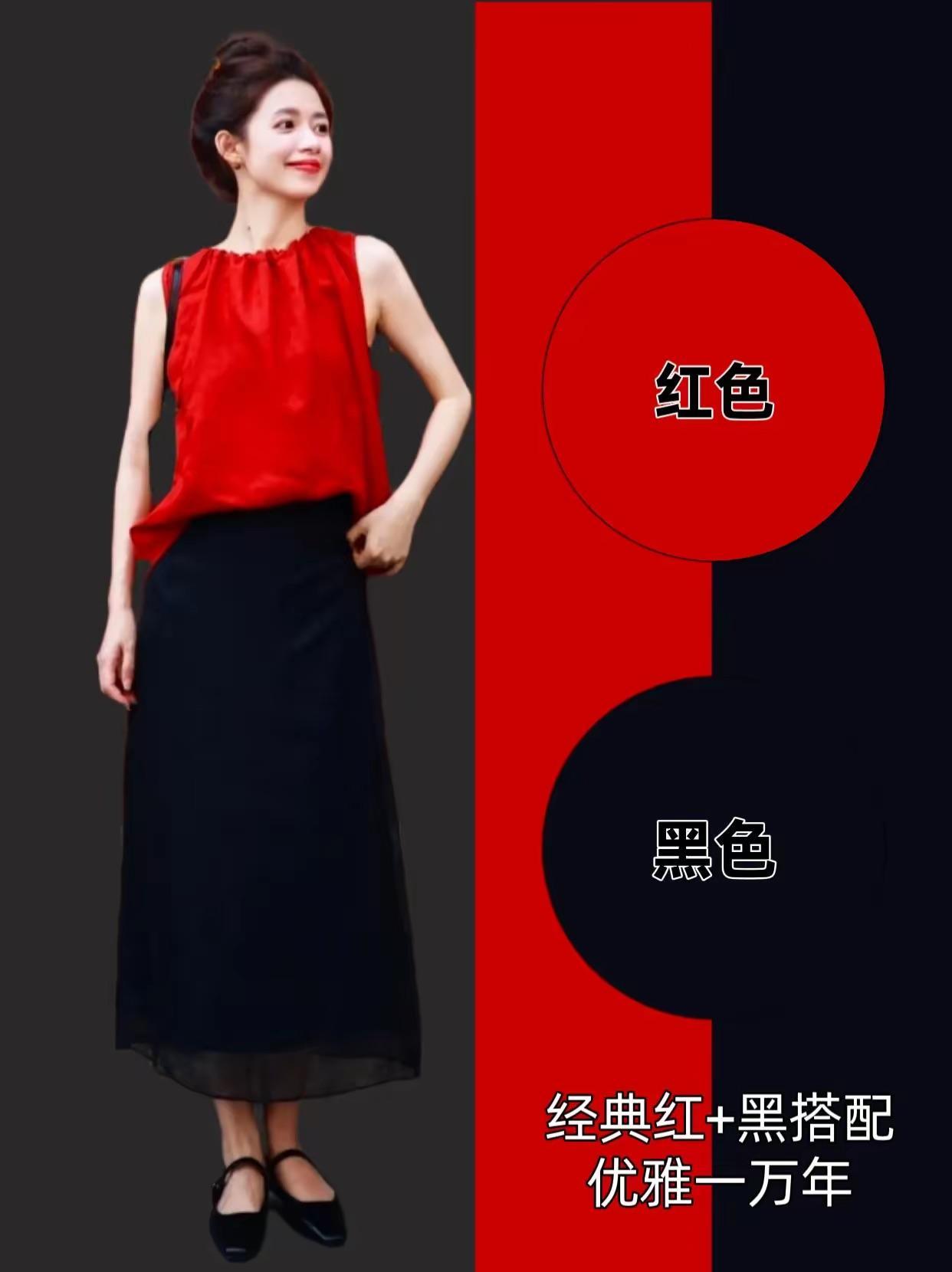 擔心紅色太張揚,不容易駕馭。可以選擇以反差對比來塑造高級範,比如驚豔的紅色背心可以配基礎款的黑色半身裙,清爽又高級的搭配一點都不挑人。
