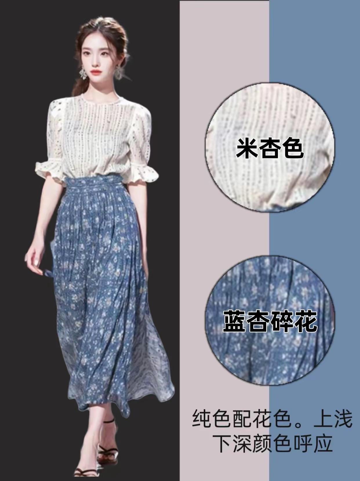 身爲女人,誰不喜歡溫柔靜謐的美呢?米杏色的襯衫,自帶溫柔氣質。藍杏碎花的半身裙,輕柔且浪漫。