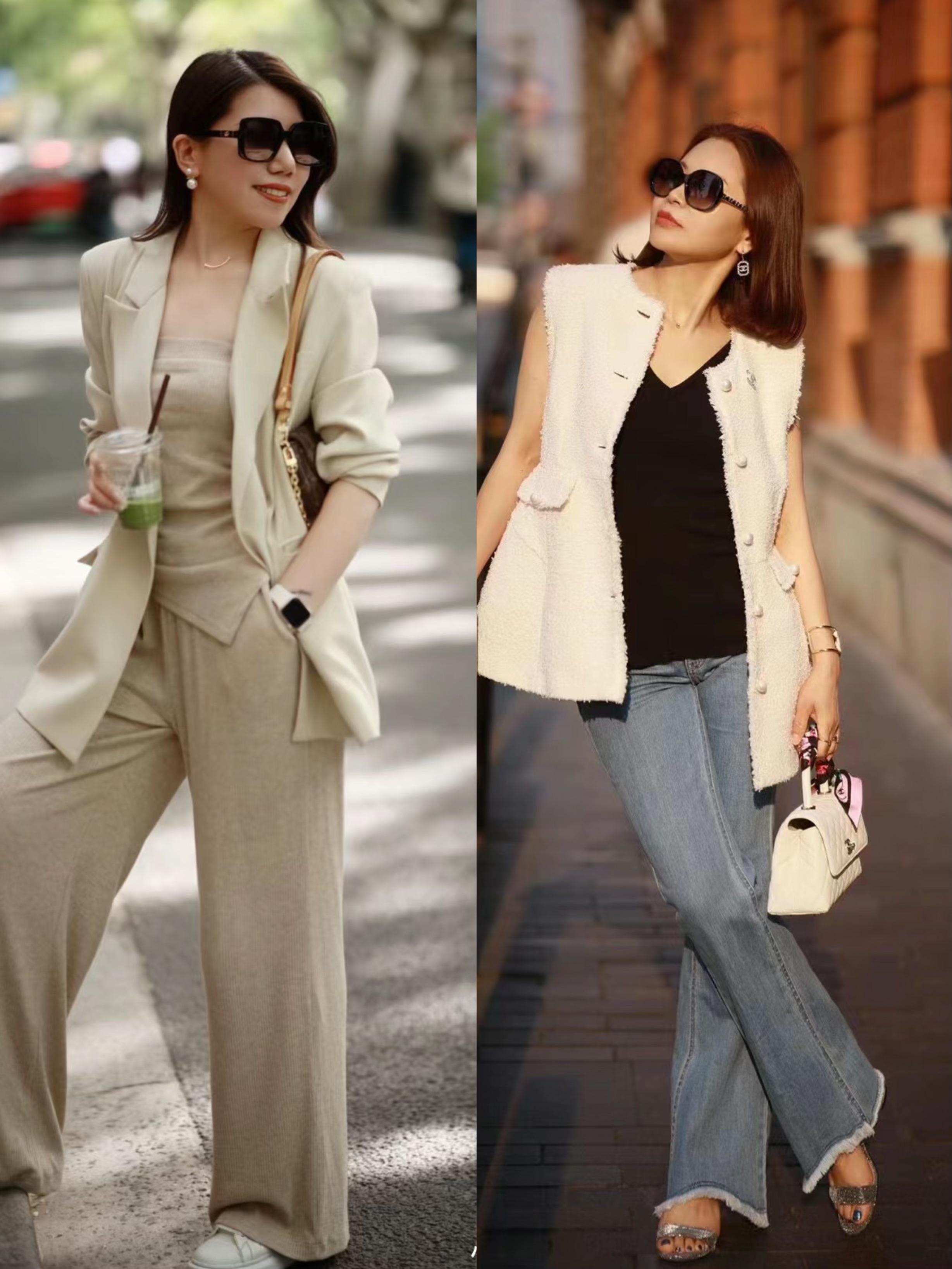 西服外套+小背心的組合,更多的在年輕女性中穿搭。如果是上了年紀的女人,嘗試這種搭配還是要有一點小心機。