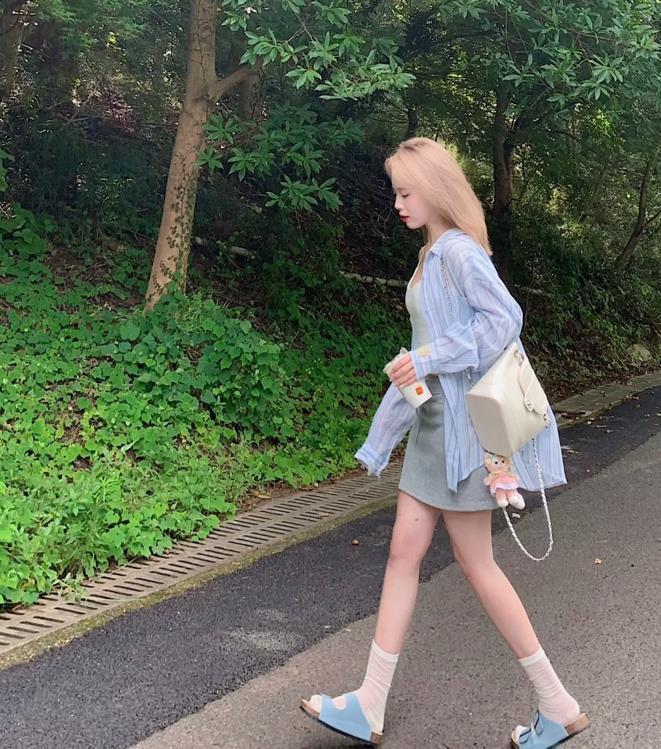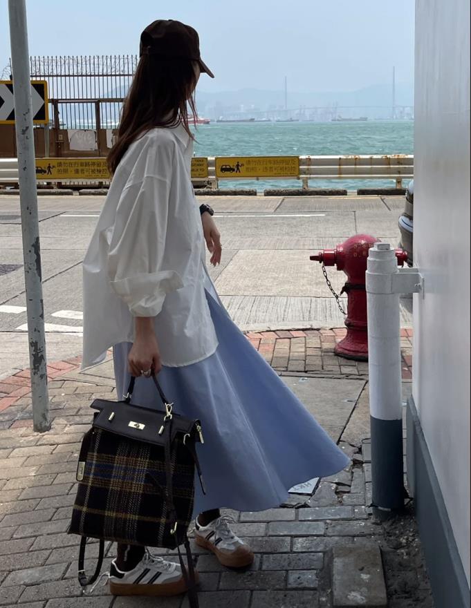永遠愛藍色,這個色調彷彿是爲夏天而生的,冷靜且溫柔,黃黑皮的姐妹,也不用擔心自己駕馭不了這個色調,你只需要降低下飽和度即可。配色上,選擇同色的鞋子,或者是同色的包包配飾進行點綴,行走間就有着無限的魅力。