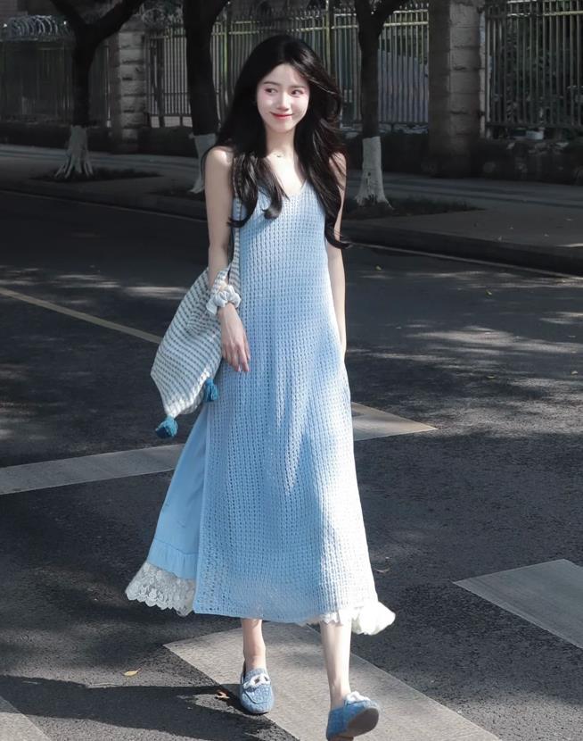 期待已久的夏天終於還是到來了,這個季節,給自己入手一款藍色連衣裙來穿,簡直美到爆炸,吊帶款連衣長裙,搭配低飽和度的藍色,很襯膚色和顯白,選擇一雙粉色運動鞋來配,一絲絲甜美的氣息就蔓延了。