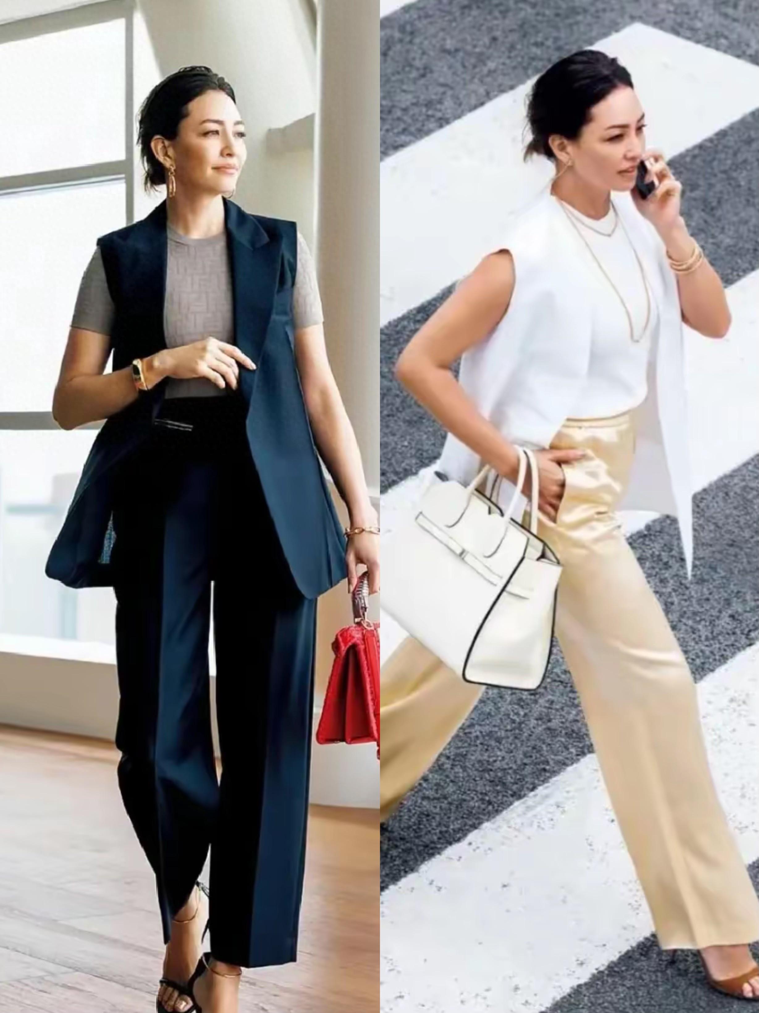 選擇小馬甲配西裝褲的穿着方式,我們可以選擇高腰的九分西裝褲,腳踝和鎖骨的位置上下呼應,讓整體風格輕盈又洋氣,配高跟鞋更提氣質。