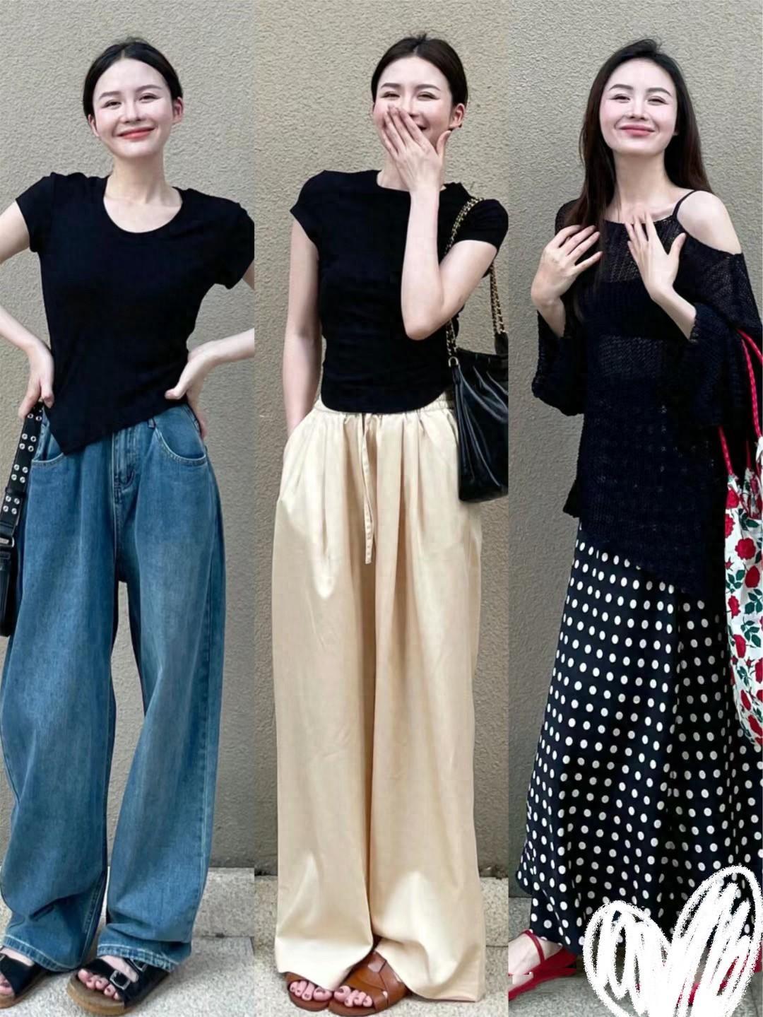 可以是T恤、吊帶背心、襯衫、也可以是開衫、或者小外套。黑色系自帶視覺收斂性,搭配修身的款式,視覺顯瘦效果更明顯,讓上下比例看起來更加勻稱。