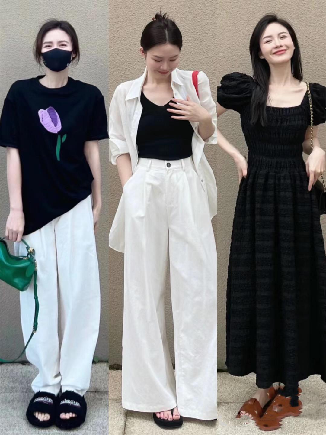 不管你喜歡酷一點、還是喜歡甜一點、辣一點,都可以用黑色上衣來凹造型。寬鬆的黑色T恤,配白色闊腿褲,盡顯鬆弛與大方。
