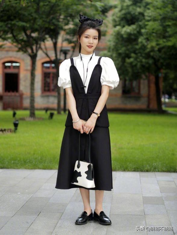 而腳上的紅色瑪麗珍鞋,儘管飽和度比較高,但是由於在造型裏佔據的面積非常小,不會給人浮誇和張揚的感覺。相反可以起到很好的點綴作用,散發出獨特的光芒。