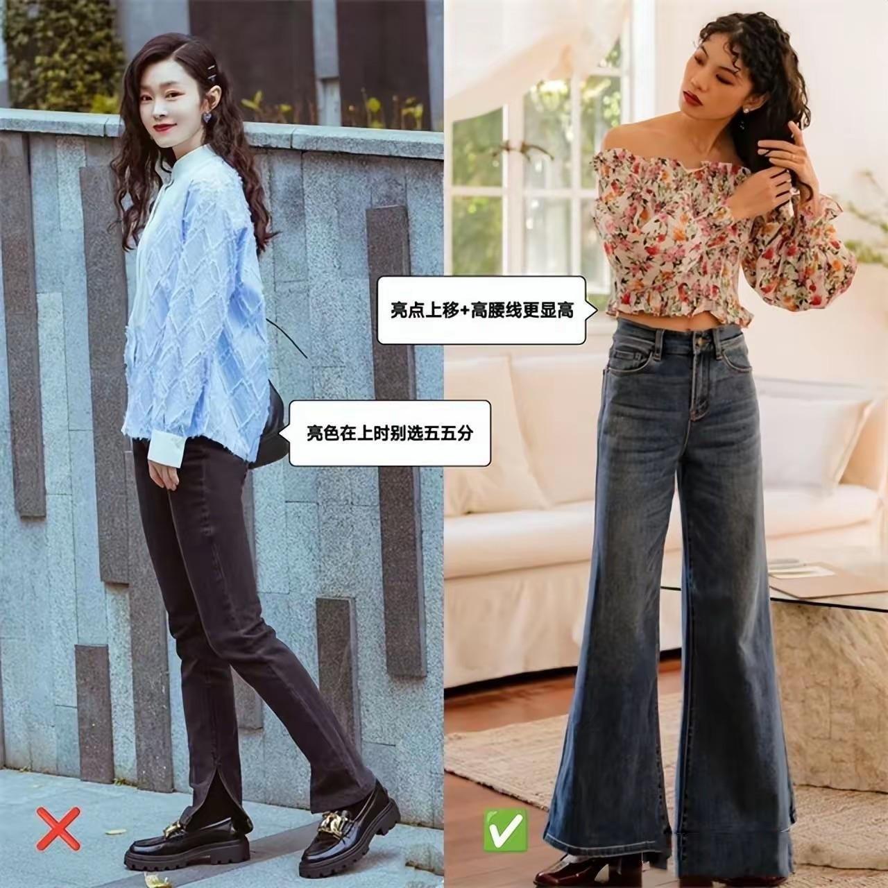 像這種一字肩的上衣,可以配高腰的微喇牛仔褲。梨形身材、或者腿型不好的女性,都可以嘗試這種高腰微喇褲,與短上衣的組合。
