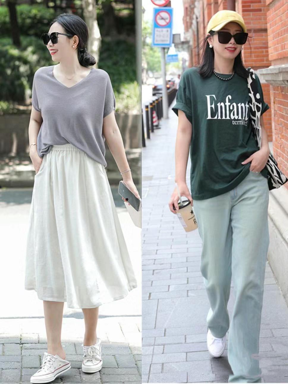 不要選擇質感太粗糙、不夠垂順的T恤。寬鬆的T恤,儘量搭配高腰的半身裙、或者淺藍色的直筒牛仔褲。將T恤下襬自然的塞個衣角,利落洋氣還很顯高。