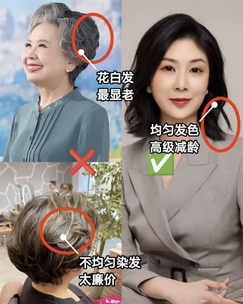 當你的頭髮開始變白,一定不要頂着一頭白裏透黑的花白髮。這樣的髮色,最是顯老了。另外不均勻的染髮,也很容易顯得廉價老氣,大家應該避開。