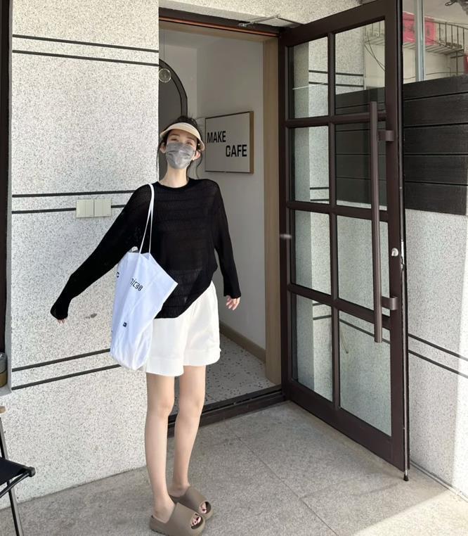 炎熱的夏季,出門一定要做好防曬,黑色防曬衫,簡簡單單又耐看,輕薄的材質,透氣性是極佳的,簡單配條白色短褲和涼拖鞋就可以出門了,清爽涼快又時髦。