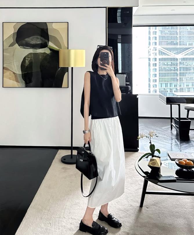 夏日的穿搭,就是要穿得簡約一些,黑與白的配色,最能打造出高級感了,也非常時尚,對於不懂顏色搭配的人來說,學會這樣穿最合適不過了。黑色無袖衫+白色半身長裙,既適合職場女性穿,又可以在日常逛街場合穿。