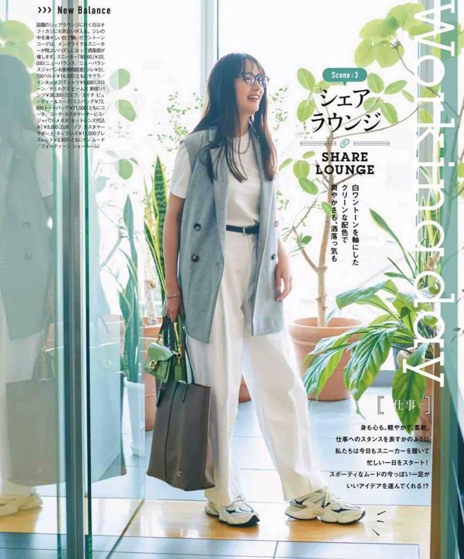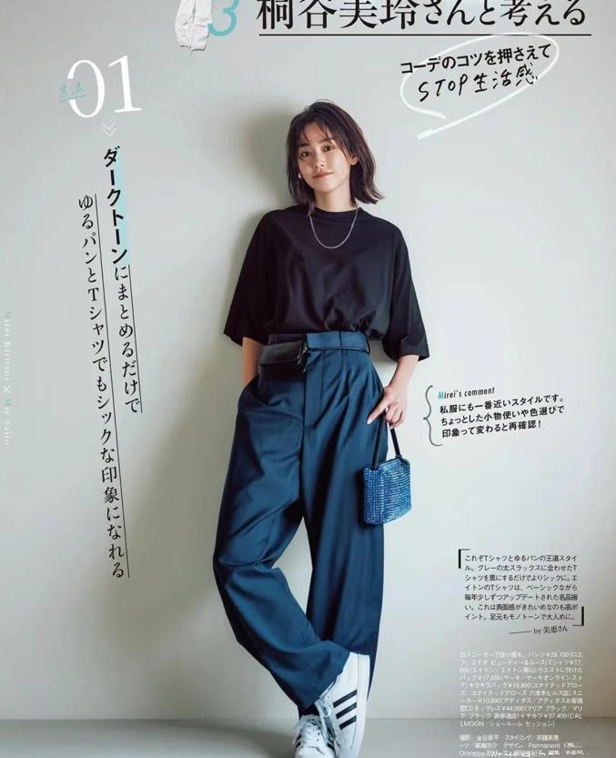 西裝款式的闊腿褲,搭配起平底運動鞋,再加上一件純色的短袖t恤,這樣的穿搭造型看起來就顯得隨性很多,記得要提高腰線比例,這樣才更顯瘦,以及拉長下身的比例線條。