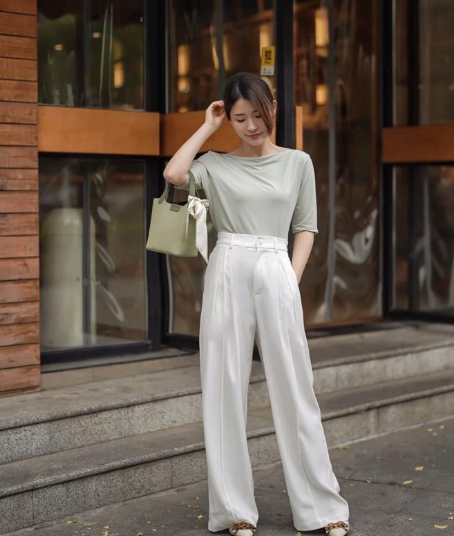 春夏季:在這個季節裏穿闊腿褲,可以選擇基礎款t恤、氣質的襯衫,以及是針織衫相配,這些上衣能與各種闊腿褲搭配一起。從而營造出輕鬆舒適的氛圍感。