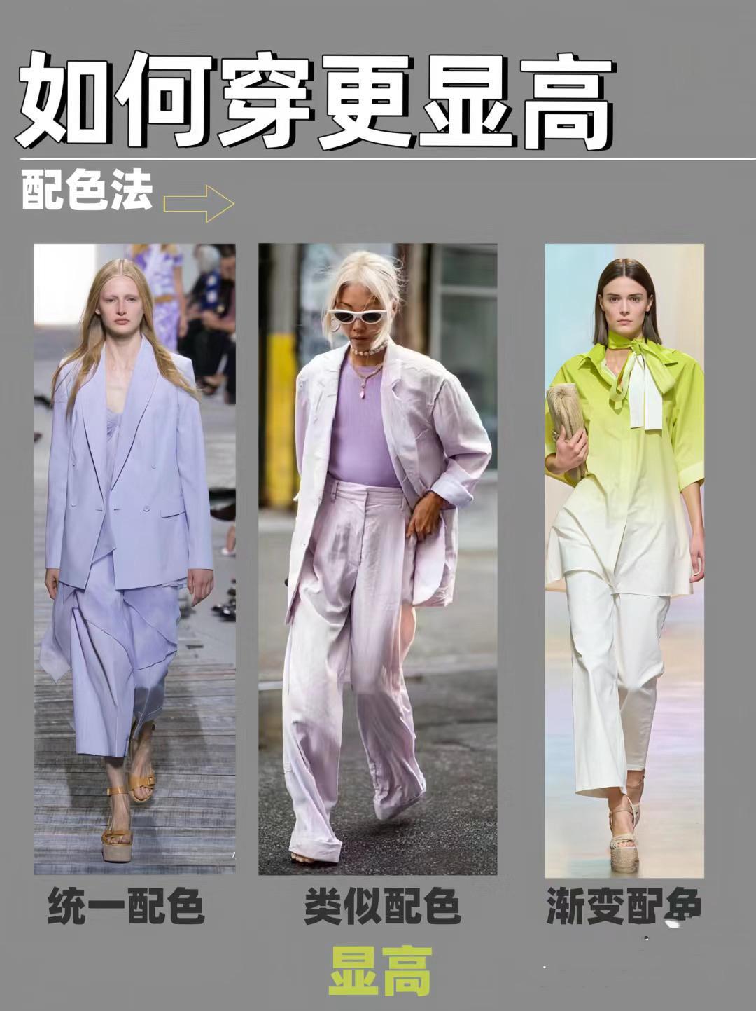 同色組合,順色搭配、漸變色的過渡,視覺延伸性都不錯,更加大方顯高。