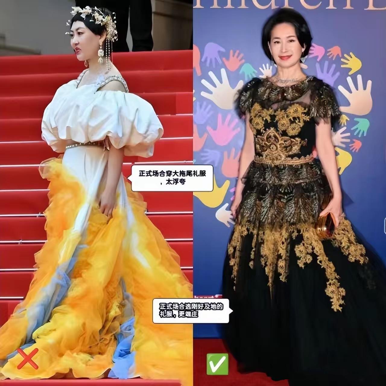 款式浮誇、設計張揚的禮裙,對於成熟女性來講、駕馭起來難度係數極高。一不小心就會顯的土氣、厚重,特別的浮誇。正式場合,還是應該以簡約低調爲主。