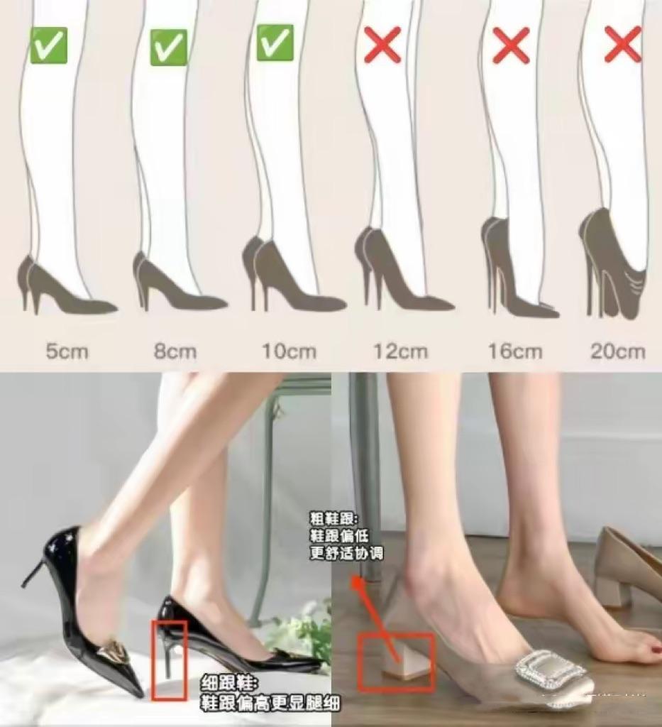 我們選擇高跟鞋的時候,可也需要搭配不同的鞋跟、以及高度。相對而言,5cm、8cm、10cm都是比較顯高、修飾腿型的高跟鞋。